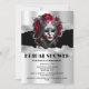 The face of a beautiful woman with silver grey skin and dark red ruby red lips is wearing an ornate, decorative faux silver eye mask that has large satin roses and plumes on it. She is set against a faux shiny silver and black background with editable black templates. This elegant, luxurious, trendy and glam design is ideal for a bachelorette, birthday, sweet sixteen or quinceanera party. Simply personalise the editable text templates to suit your special occasion.