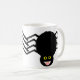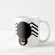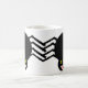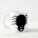 A mug featuring a spooky black spider with eight hairy legs, yellow eyes with big black pupils and its mouth open showing its fangs.