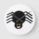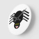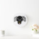This awesome clock features a spooky black spider with eight hairy legs, yellow eyes with big black pupils and its mouth open showing its fangs.