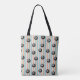 This tote bag has a mid-century modern design of black circles with white circles inside and star bursts inside them all set over stripes of varying sizes in shades of coral and seafoam. If you like the design but want different colours, message me.