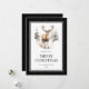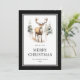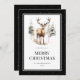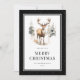 Black Merry Christmas card featuring stars and a watercolor illustration of a stag. Easily personalise this elegant black holiday card with your family name.