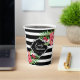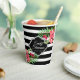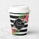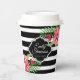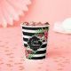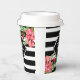 Black and white geometric stripes and pink exotic flowers. Customisable paper cup template