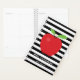 This planner features a design for a teacher. The background is a trendy black and white horizontal stripe pattern with a digital illustration of a red apple. Custom text allows you to add the teacher's name and grade.