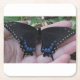 The Beautiful Black Swallowtail Butterfly. This one is a female with her blue spots. Males have yellow. Their host plant is parsley. One of the most beautiful of butterflies, the State Butterfly of Oklahoma. She was just reborn from her cocoon about 10 minutes prior to my photograph of her in my hand. They have 6 legs, black body and wings with spots of white on the tips. Enjoy the lovely Black Swallowtail Butterfly on Coasters in my store! Copyright Photography by Deborah Carr