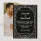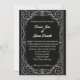 A bold and captivating expression of elegance, this wedding invitation design pairs an intricate, ornamental aesthetic with modern refinement. Set against a rich black backdrop, the layout offers ample space for wording, allowing your announcement to speak with clarity and grace in contrasting white script. A fine, understated border surrounds the card, framing the content like a piece of art—striking yet respectful of the open space within. Subtle detailing near the edges echoes the language of lacework or etched metal, adding depth and intrigue without overpowering the overall composition.