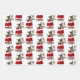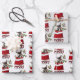 The repeated pattern on these Christmas wrapping paper sheets is an image of an adorable black and tan Chihuahua dog peeking out from a red and white Holiday gift bag. Behind him is a sprig of holly and red berries. Stylised red and black buffalo plaid text says MERRY CHRISTMAS". The background on two of the sheets in this set is white, while the third sheet is silver.