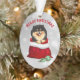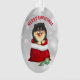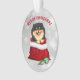 An adorable little black and tan Pomeranian pops out of a red gift bag on the front of this Christmas ornament. A few teal and gold pattern Holiday tree bulbs lay just in front of the Santa bag.The text above the image says "MERRY CHRISTMAS" in red. The image and text are placed on a silver abstract bokeh background. The back of the ornament has the same image, but with the text "HAPPY NEW YEAR" in teal green.