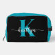 This simple, elegant black toiletry bag with your first name in a trendy script font in white and your first initial in a modern cap font in teal is perfect for you. It's stylish and trendy and yet very classic. It will be fabulous for school, the gym, work, your car - will make keeping your makeup or toiletries all in one place when you're away from home.