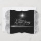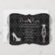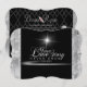 A Love Story Never Ends Black Tie Wedding Theme. Sparkling diamond look with white satin frames "A Love Story Never Ends" typography. Invitation set on a black diamond velvet look background with satin frame. Diamond glass slipper with ruby love knot, emblem and matching diamond tie.