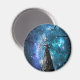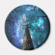 Black trees & branches against a turquoise blue & purple galaxy space sky.