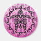 Black tribal Polynesian tattoo style turtle design in the centre of a Maori sun symbol. Pink Hawaiian pattern of pink Hawaiian Honu sea turtles and pink tiki masks.