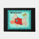 Show your dog love with this scottie welcome door mat for your home or work. The word "welcome" can be personalised to another word or name. This rug features a whimsical champagne coloured Scottie Terrier that is wearing an red tee shirt with turquoise teal trim. A yellow and red ball is beside him or her. The background is turquoise teal blue stripe with a teal border with black paw prints. A serpentine line border is inside the teal border. Two yellow flowers are above the dog. This cute, cuddly and trendy dog is original art by Phyllis Dobbs and will melt the heart of a dog lover. This Scottie dog door mat is fully customisable to make it your own!