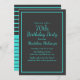 Celebrate a remarkable milestone with this elegant 70th birthday party invitation, featuring a deep charcoal background accented by vibrant aqua typography for a bold yet timeless look. A refined double-line border frames the design, while graceful script lettering paired with clean serif text creates a sophisticated balance of classic and modern style. Perfect for honoring a woman’s 70th birthday, this invitation is ideal for evening gatherings, cocktail parties, or stylish home celebrations. The high-contrast color palette ensures excellent readability while clearly presenting the honoree’s name, event details, and RSVP information in a polished, upscale layout.