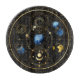 Beautiful blue and gold astrological and celestial symbols within golden circle and placed on an image of black velvet with gold flakes.