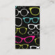These are stylish business cards perfect for eye doctors and optometrists. The cards feature a vertical layout with a black background with a brightly coloured printed pattern of eyeglasses frames on the back and a matching blue glasses frames graphic on the front. Use the fill in the blank fields to easily customise these cards with your information.