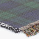 Colourful custom fringe end throw blanket made with graphics of the green, blue, and black traditional Scottish Black Watch tartan plaid pattern. Tan coloured old world style text can be personalised to read what you want. Lovely gift idea for anyone.