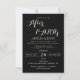 A sophisticated black wedding after-party invitation featuring elegant white typography and a modern minimalist layout. The design highlights a stylish handwritten “After Party” script paired with classic serif lettering for a refined, upscale look. Perfect for couples hosting a private ceremony followed by a celebration, this invitation clearly displays the couple’s names, event details, date, time, location, and RSVP information. A timeless and classy design ideal for weddings, receptions, and evening celebrations.