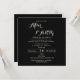 A sophisticated black wedding after-party invitation featuring elegant white typography and a modern minimalist layout. The design highlights a stylish handwritten “After Party” script paired with classic serif lettering for a refined, upscale look. Perfect for couples hosting a private ceremony followed by a celebration, this invitation clearly displays the couple’s names, event details, date, time, location, and RSVP information. A timeless and classy design ideal for weddings, receptions, and evening celebrations.