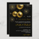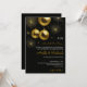 Black wedding invitation with gold text and glittering ornaments. Fireworks and baubles convey a festive New Year’s Eve theme. Elegant and celebratory.
