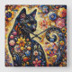 Black Whimsical Cat Abstract Floral Painting Art Square Wall Clock