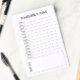 Daily planning notepad with a 7:00 am to 7:00 pm schedule and a box to jot down notes in a minimalist white and black design. Daily planner notepad personalised with your name in bold letters. Clean daily planning notepad in white with black text.