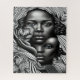 This graphic design is a stunning example of black and white art. It features two African American young women with one blue eye each, creating a striking contrast. The graphic design is trippy and psychedelic, with highly intricate and midcentury modern patterns, making it suitable for various products. This graphic design will catch your eye and captivate your mind.