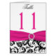 This black and white damask table number card with FAUX fuchsia ribbon and jewels matches the wedding invitations and other items shown below.  There is also a post card style version table number card, if you prefer that. If you require any other matching items, please email your request to niteowlstudio@gmail.com.