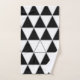 A bath towel set decorated with a geometric triangle pattern in black, white and grey. The rhythm is broken by one triangle in in white.