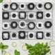 Black and white circle and square pattern with grey shade stripes. Modern contemporary fashion design. sgb01