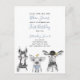 Your baby boy is turning one! Invite your special guests with this adorable invitation postcard featuring hand drawn farm animals (a horse, a pig, a cow and a chick) in black and white. Baby's name, "first birthday" and the date are in blue hand lettered script typography, and personalised in a chic modern black sans serif. Copyright Elegant Invites, all rights reserved.
