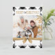 Accent your holiday photo with a black and white buffalo check plaid design, titled MERRY CHRISTMAS in a brown Kraft paper font with hand-drawn winter foliage and tied neatly with a gold brown bow. Contact the designer if you would like this design modified or on another product.