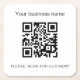 A stylish, classic white background. Personalise and add your business name, your own qr code and a text. Black text.