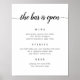 Invite guests to grab a favourite libation from the bar with our charming wedding bar menu sign. 11x14 poster features the headline "the bar is open" in crisp black calligraphy script and block lettering. Personalise with your wine, beer and spirits selections beneath.