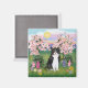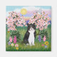 Trees with beautiful spring blossoms in shades of pink form the background focus for a black and white American Short Haired cat. A dove flies overhead on this lovely spring day.