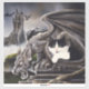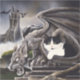 Black and white tuxedo kitten is sitting beside a gargoyle. Behind them is a castle and dragons.