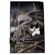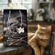 Black and white tuxedo kitten is sitting beside a gargoyle. Behind them is a castle and dragons.