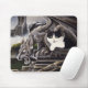 A black and white Tuxedo kitten is sitting with a gargoyle. Behind them is a gothic castle.