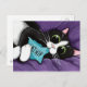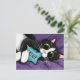 A black and white cat lies on a purple blanket while clutching a catnip pillow in this fun cat art postcard. Send to your friends or keep as part of your own collection. A postcard that cat and animal lovers will adore. Copyright © 2009 Lisa Marie Robinson. All Rights Reserved.
