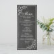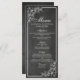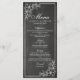 Modern Wedding Menu Rack Cards Templates - Elegant Script and White Floral Frame on Grunge Black Chalkboard Background.