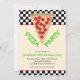 This pizza party birthday invitation features a piece of pepperoni pizza and a black and white chequerboard background with bright green text. This is a perfect invitation for a young boy or girl celebrating his/her birthday with friends. The text is customisable.