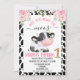 Cute cow themed or have you heard the moos first birthday invitation for a little girl. This girl's birthday invitation design features a cute black and white cow, a bold cow print pattern, some lovely pink floral arrangements and a removable faux gold glitter one.