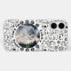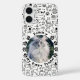 This customizable phone case features a charming black and white doodle pattern of whimsical cats in various poses. The center design includes a circular photo placeholder framed by customizable text, allowing you to feature your favorite feline friend's name and portrait for a truly unique and personal accessory.