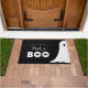 A cute ghost peeks out from the edge of the doormat. "Peek a BOO" text in fun handwritten and decorative style fonts. Shown in colours of black, white, and orange, but all colours are editable. Personalise the curved text with a family name, etc. © Kimbellished, LLC