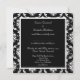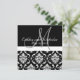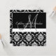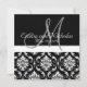 Black and White Damask Wedding Invitation and RSVP card combined with place holder to write guest' name right on invitation. Design by Elke Clarke©2010. Grey monogram initial with white script font text overlay on a black background. Place holder for guest name is on the back which you can write in by hand with a silver or gold metallic pen (so it shows up on the black background). Or take advantage of the fact that you can order your invitations one at a time, so you can use the Zazzle edit menu to add your guest' name and have it printed right on the invitation. So for 10 guests you would have 10 orders of "1" in your cart, each with a different guest name in the design. Customise with your wedding information and colours.