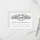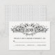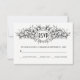 Black and white floral heraldic crest wedding RSVP response card. It showcases a heralded crest with flowers. The back includes a black and white polka dot pattern.
