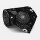 An elegant neck tie design with a geometric floral pattern, featuring stylized versions of a selection of flowers including: Japanese anemones, daffodils, violets, pansies, daisies, roses, Michaelmas daisies, cinquefoils, primroses, buddleia, clematis, gardenia, phlox and forget-me-nots. The print is white with a subtle grey behind on a black background.