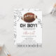 Mostly black and white football themed baby shower invitation featuring a large football, sidelines and football plays.