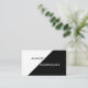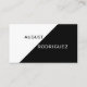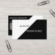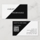 Modern black and white geometric business cards feature your name on the front in black text on white and white text on black. The back features a customisable QR code, your job title/speciality/company name, and contact information on a reversed black and white colour block pattern to the front. Personalise the QR code with your portfolio or website link and add your text in the sidebar.