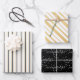 Stylish and festive, this gift wrap set is the perfect way to wrap your gifts this holiday season. The design features three elegant patterns: 1. gold and white candy cane stripes, 2. black white and gold stripes, and 3. white "merry and bright" calligraphy font and stars over a black background.