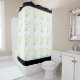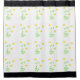 Designer shower curtain with white Daisy pattern with accents in yellow and green, and black stripes.